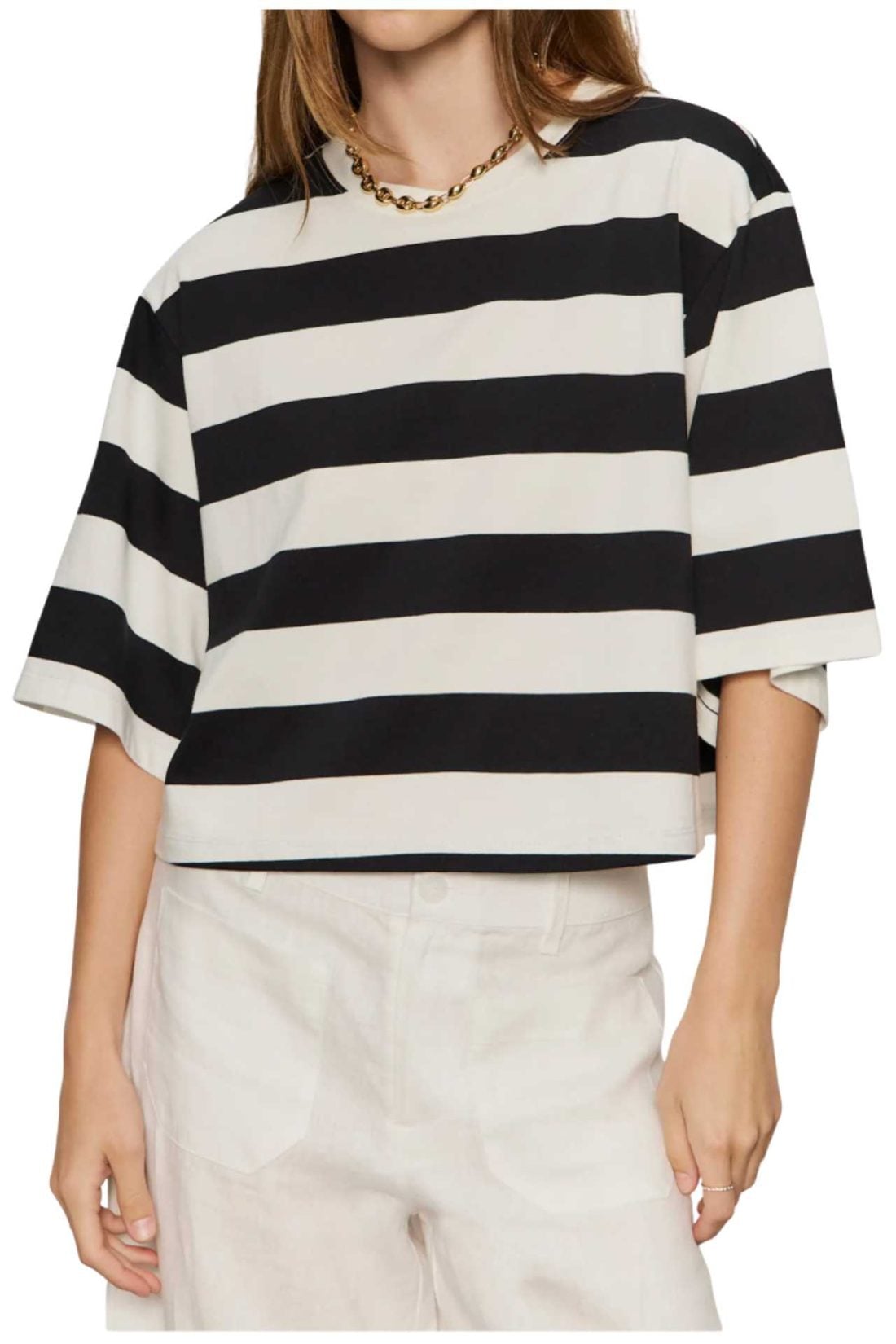 Bold stripes, a boxy silhouette, and big sleeves. A fresh feeling tee for spring! Cut from organic cotton, this tee goes great with high rise wide leg trousers and the cropped jacket featured above!
