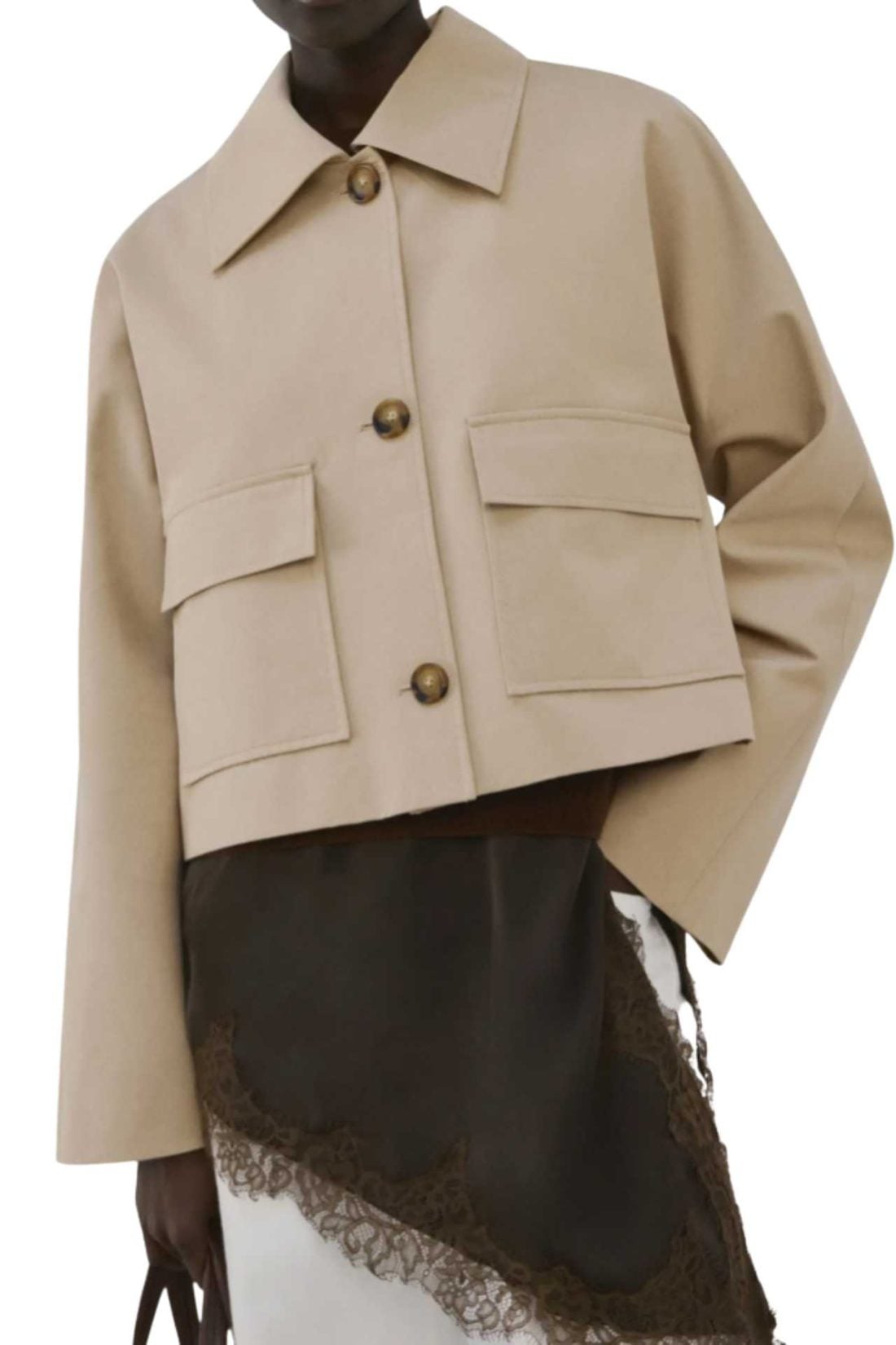 This boxy cropped cotton jacket is the perfect layering piece for spring. It’s equally chic with a pencil skirt as it is paired with your favorite light wash denim.