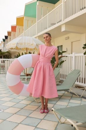 Today I want to highlight the bow dress – my personal favorite style in the collection. This moire dress can be dressed up as well as dressed down and is available in three incredibly versatile colors – pink, navy, and black. The sash can be tied SO many fun ways! I created a quick video below showing a few of the ways to tie it, and it looks equally chic with the sash tied in the back, keeping the front clean.