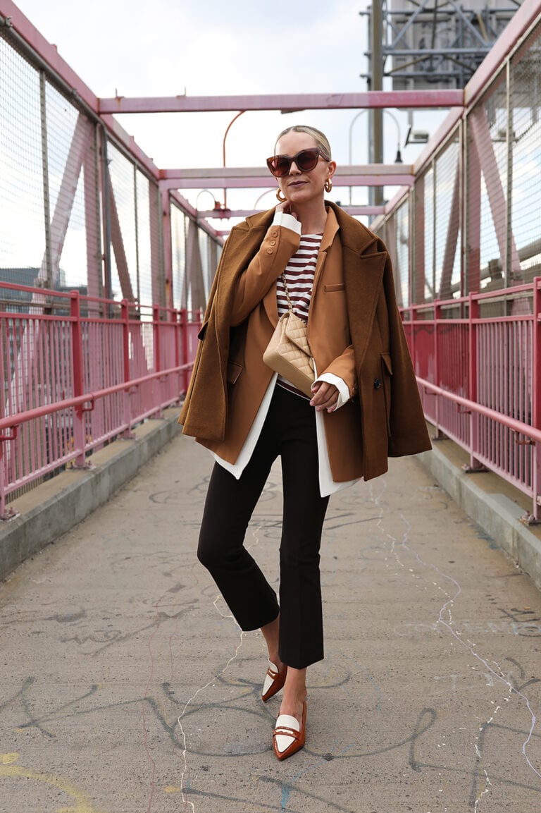 Pants: Frame // Stripe Tee: Nordstrom (under $40) // Coat: Open Edit (under $100) // Shoes: Nordstrom (under $150) // Blazer: Favorite Daughter // Sunglasses: Le Specs (under $75)