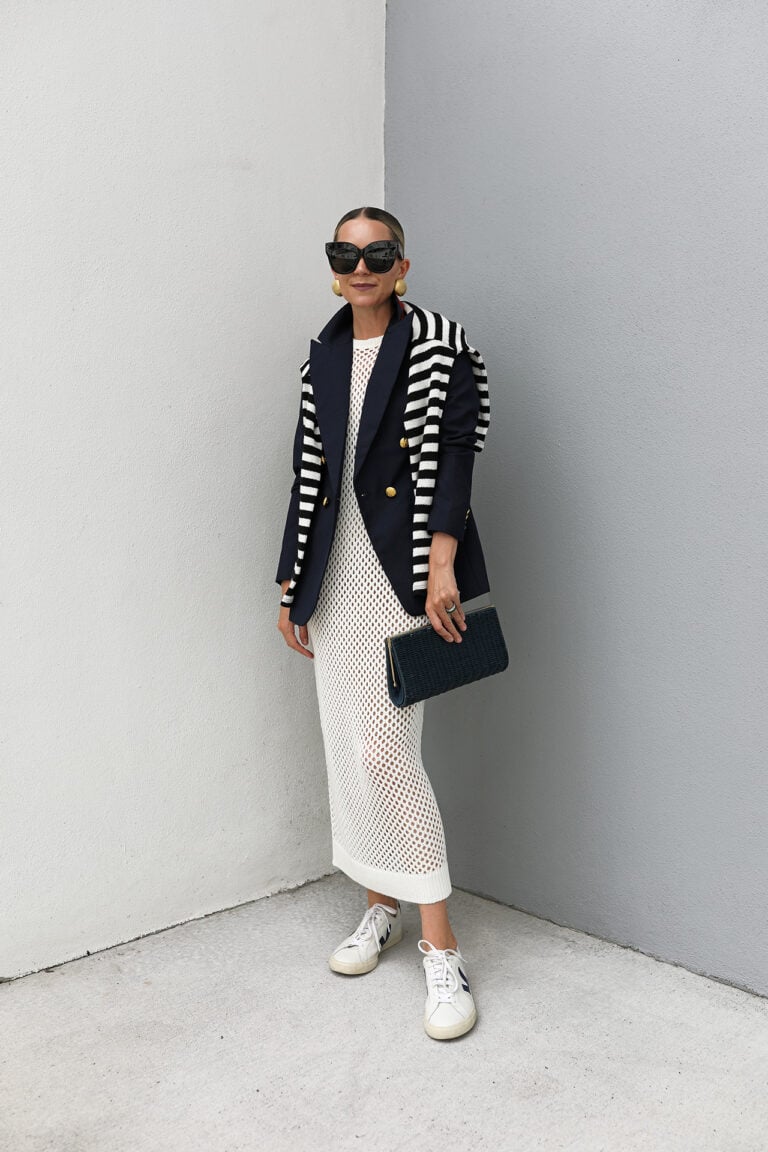 CASUAL Dress: Nordstrom // Blazer: BR // Shoes: Veja // Bag: Pamela Munson // Sunglasses: Linda Farrow