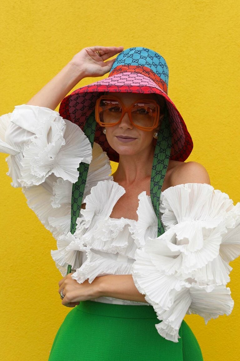 Hat: Gucci // Top: Rosie Assoulin // Skirt: Delpozo // Sunglasses: Linda Farrow
