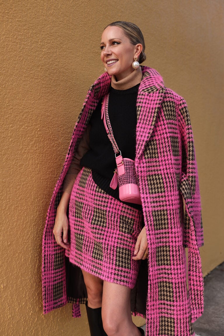PINK CHECKS Coat: Boden // Sweater Vest: Boden // Skirt: Boden // Earrings: Lele Sadoughi (sold out, similar here)