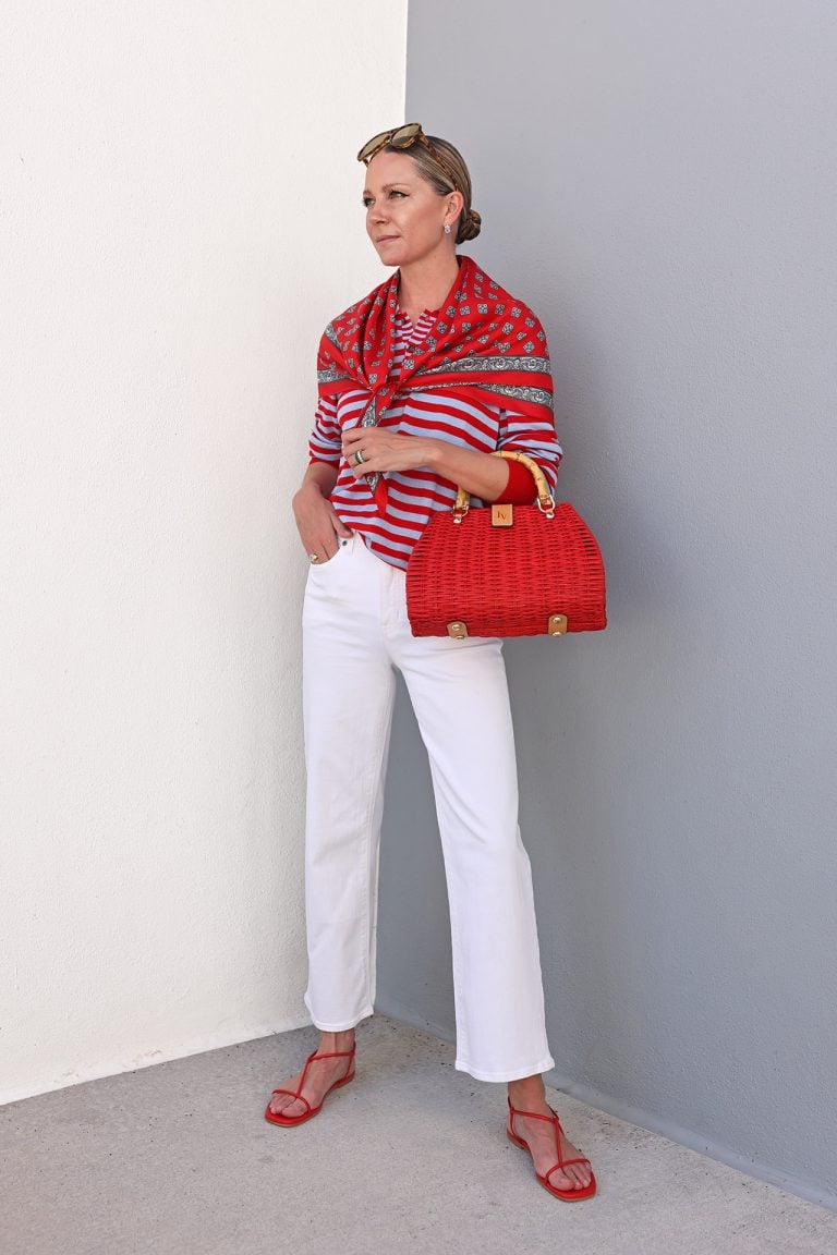 Denim (currently my favorite white everyday denim) // Sweater // Bag // Sandals // Scarf
