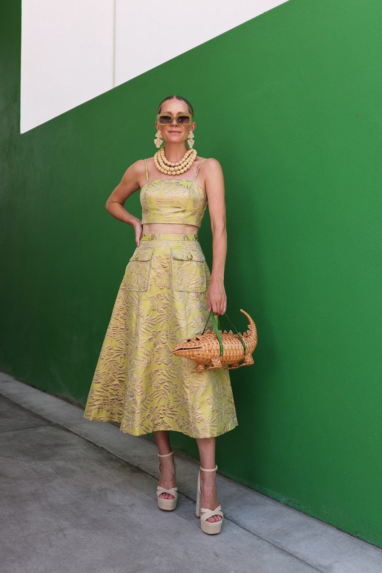 Skirt: Trina Turk // Top: Trina Turk // Earrings: Tnuck // Necklace: Tnuck // Shoes: Hill House Home // Bag: Kate Spade