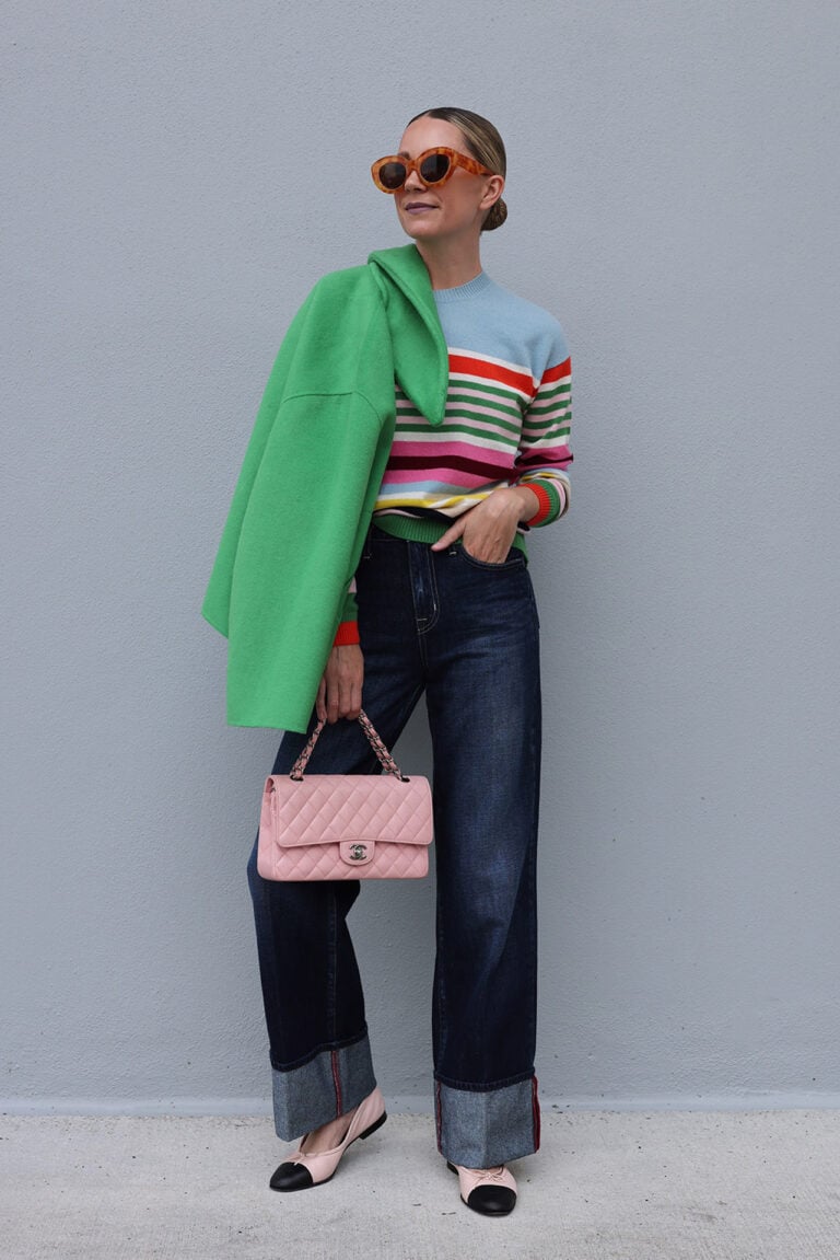 WIDE LEG JEANS Sweater: Boden // Jeans: Saks // Jacket: Ganni // Shoes: Chanel // Bag: Chanel // Sunglasses: Amazon